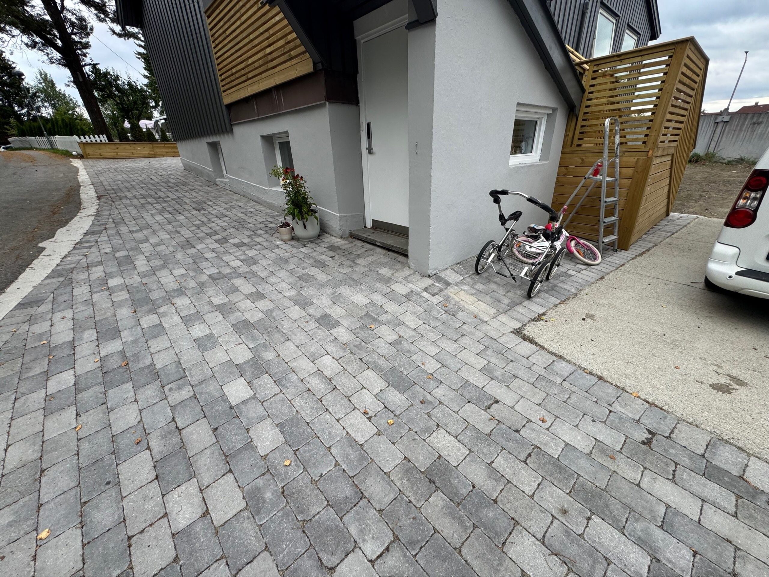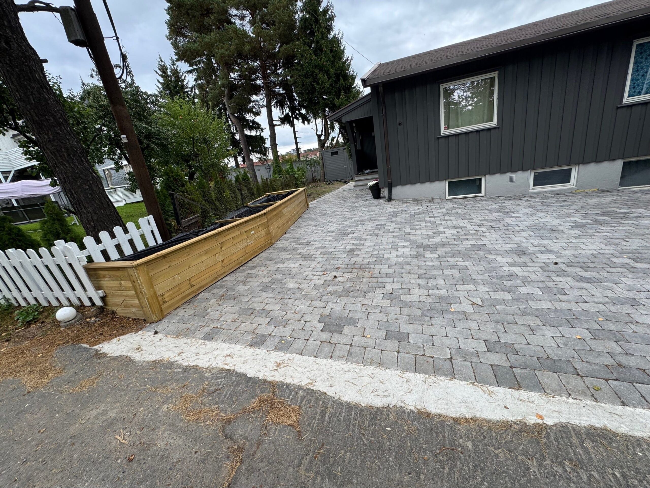 Etter dreneringsarbeidet la vi duk, nytt bærelag og belegningsstein på gårdsplassen. Resultatet ble både praktisk og estetisk: et solid underlag og et flott uteområde som gir boligen et helhetlig løft.