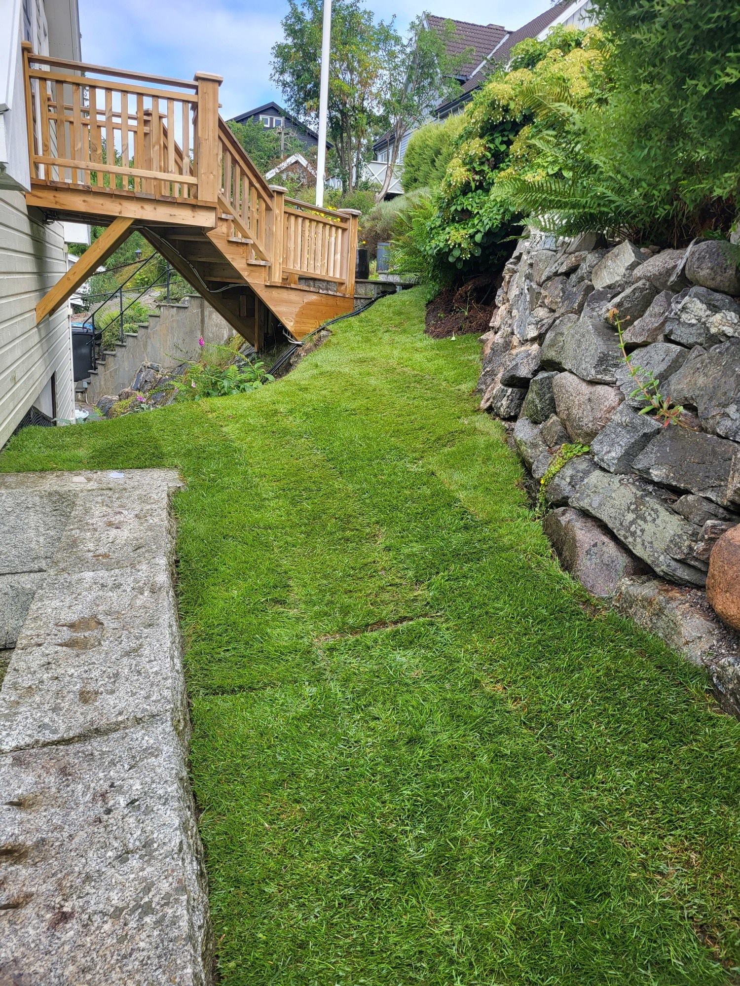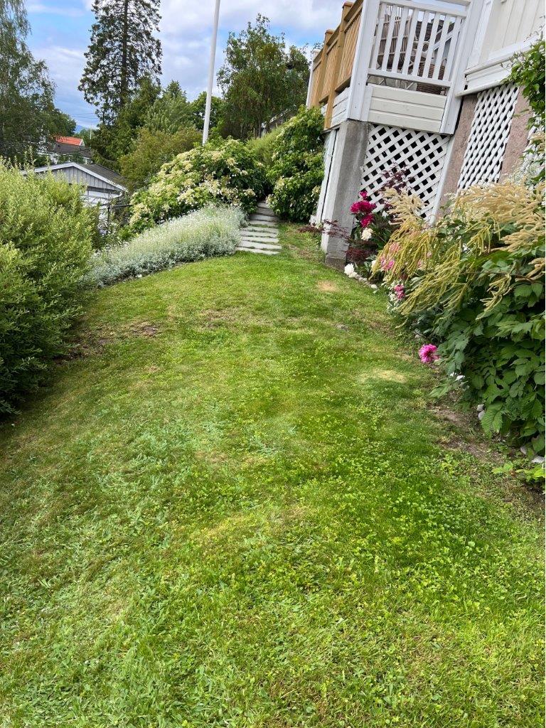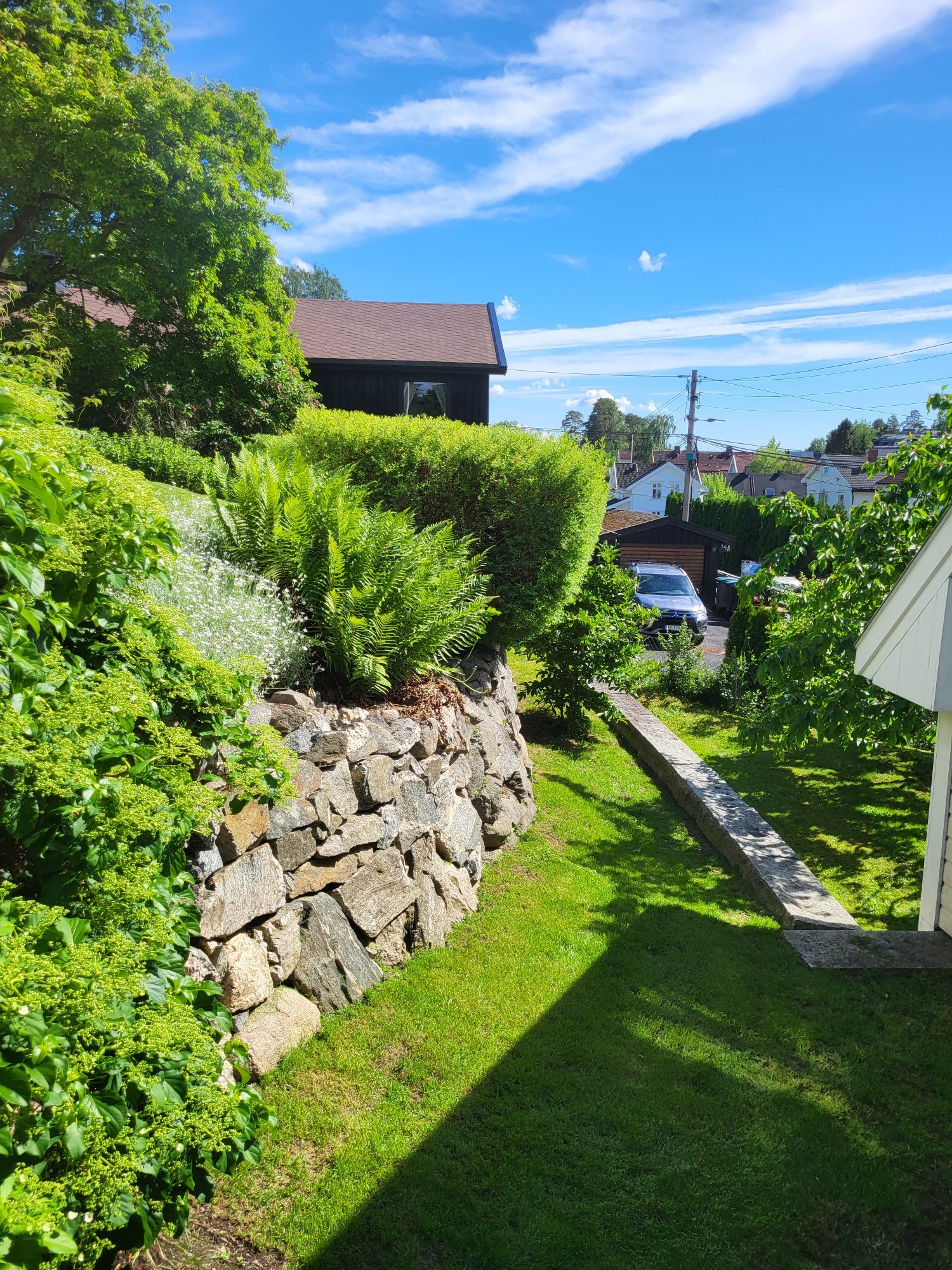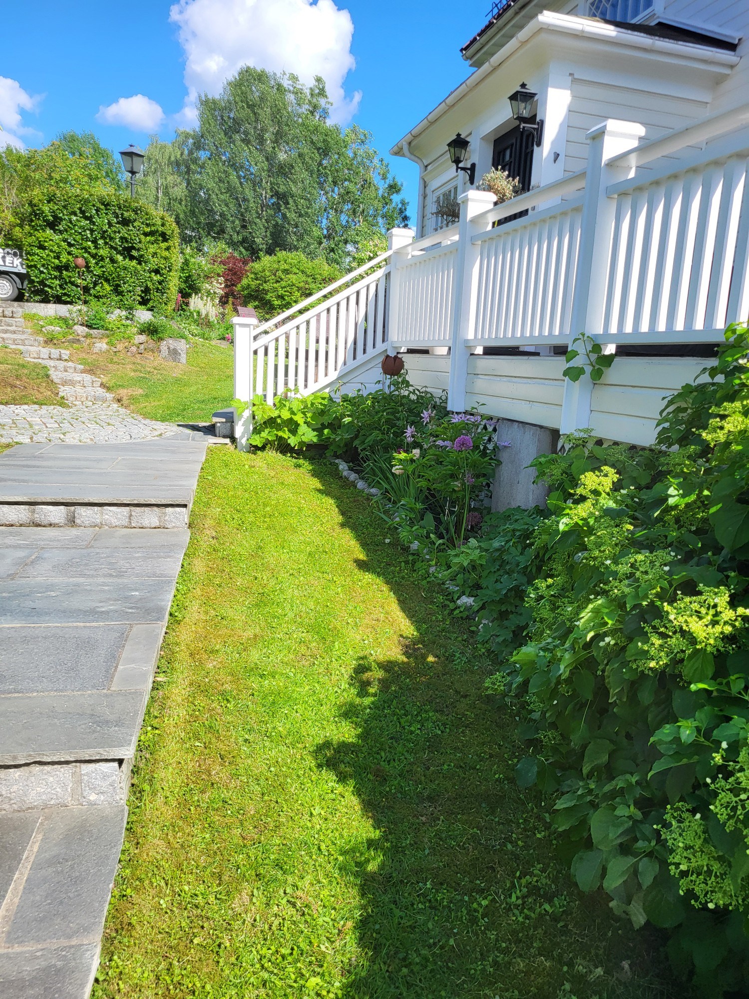 Eiendommen består av flere nivåer med blomsterbed, buskfelt, frukttrær og plen. Vi følger opp hagen jevnlig med beskjæring, luking og stell slik at beplantningen holder seg sunn og harmonisk. Uønskede fremmedarter fjernes systematisk, og alt hageavfall håndteres separat for å hindre spredning. Blomsterbedene renses og gjødsles, mens klatreplanter bindes opp for optimal vekst og et ryddig uttrykk.
