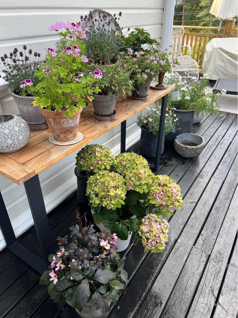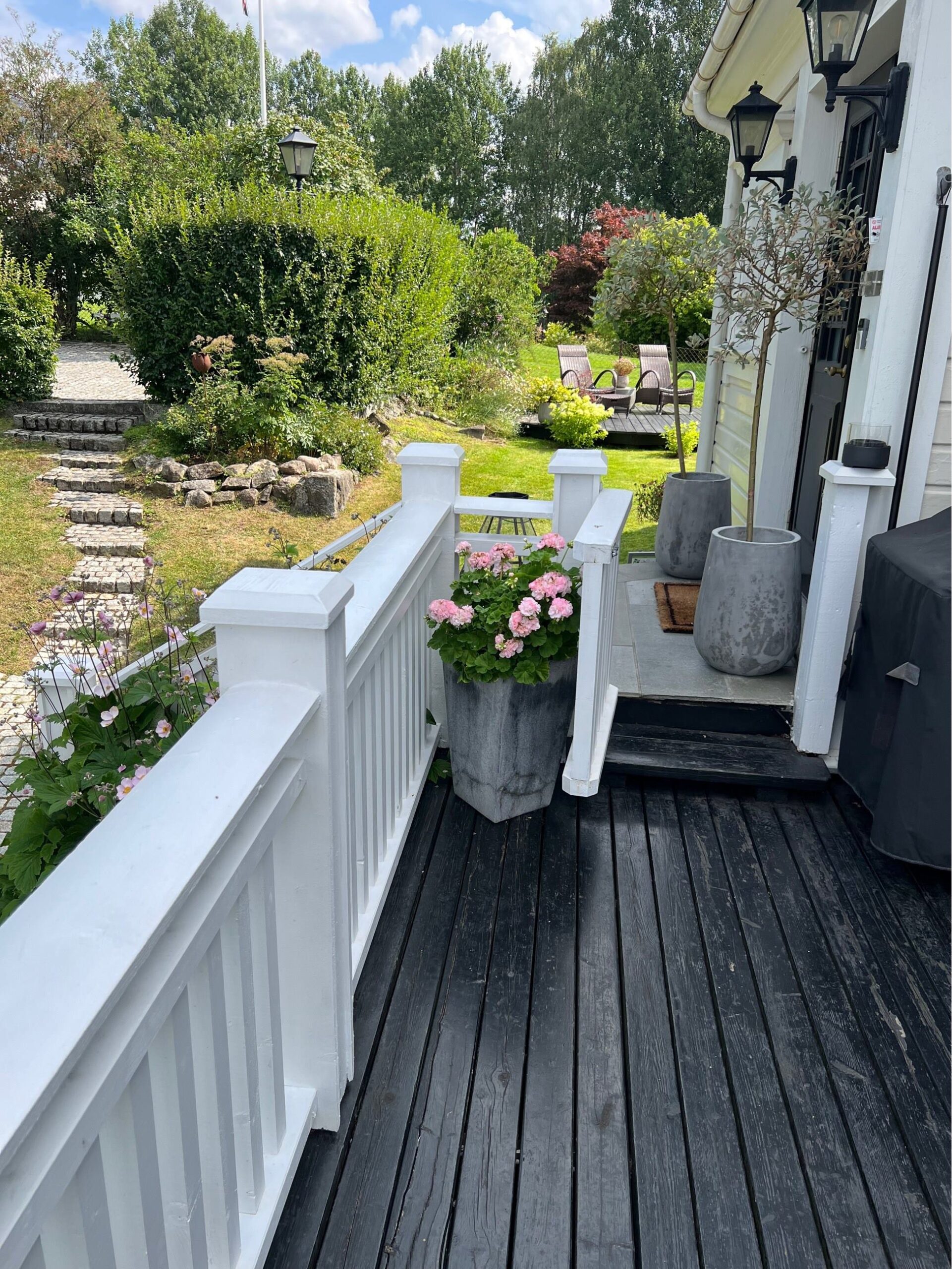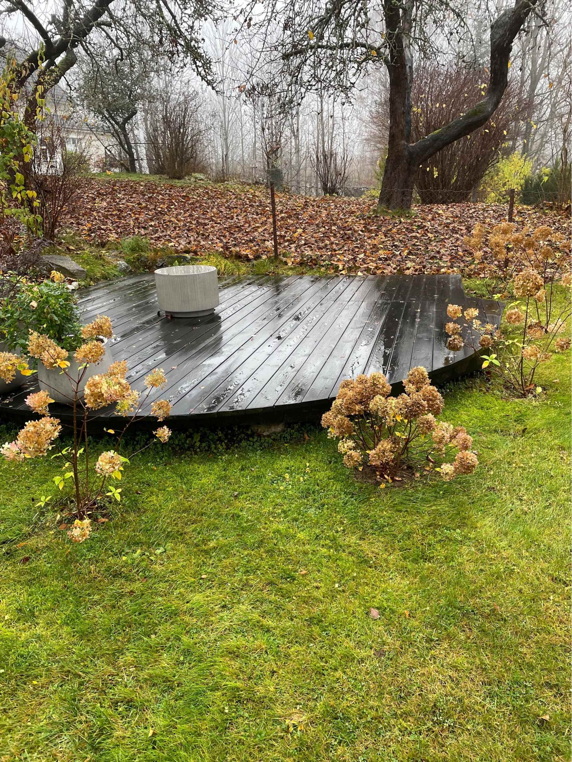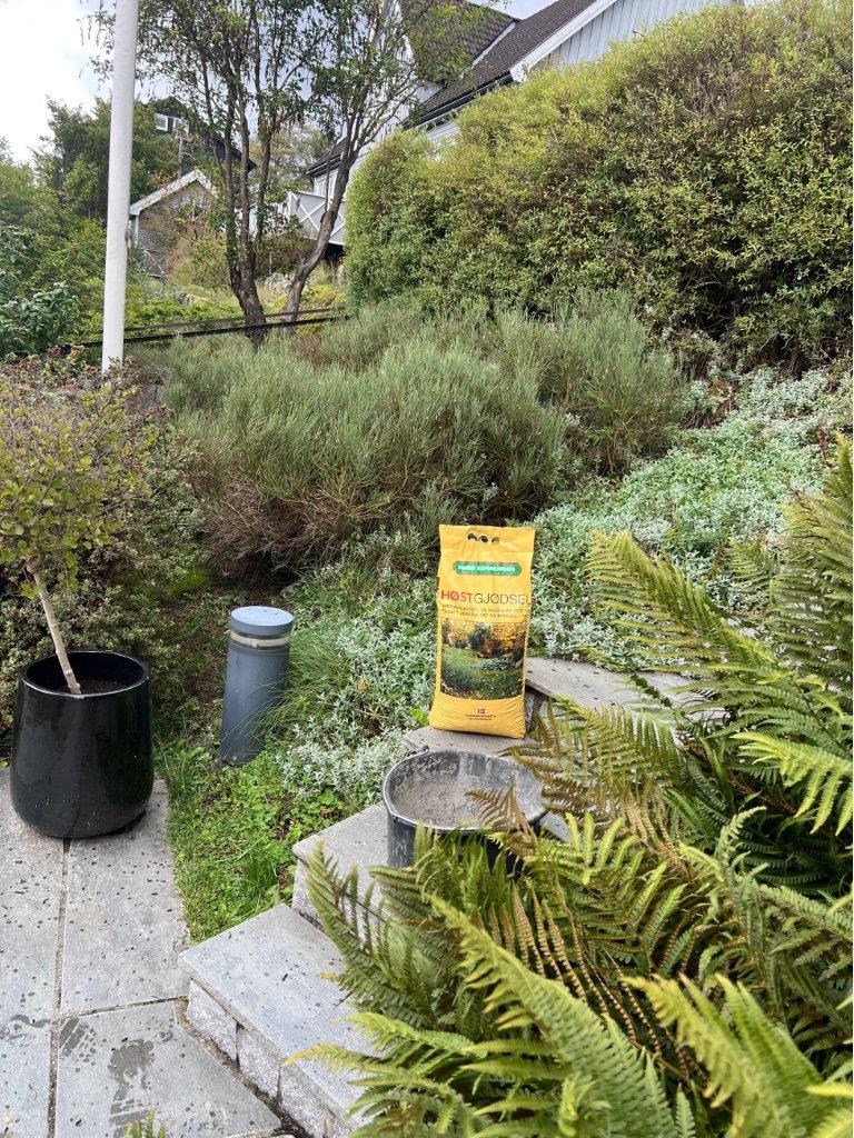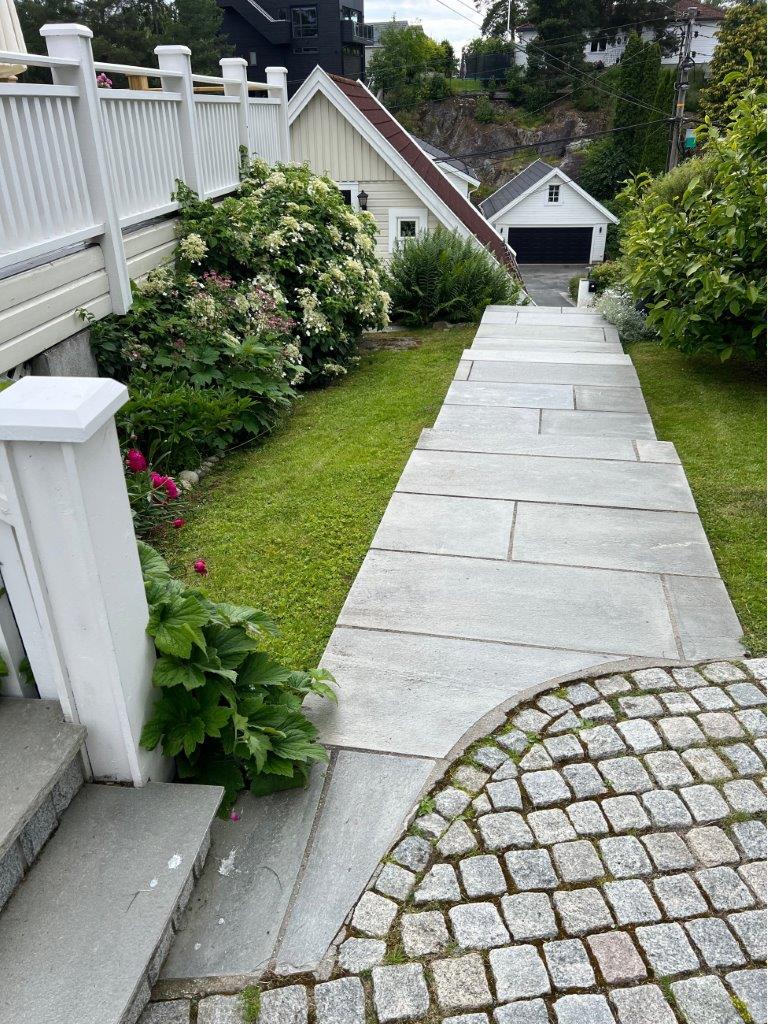 Eiendommen består av flere nivåer med blomsterbed, buskfelt, frukttrær og plen. Vi følger opp hagen jevnlig med beskjæring, luking og stell slik at beplantningen holder seg sunn og harmonisk. Uønskede fremmedarter fjernes systematisk, og alt hageavfall håndteres separat for å hindre spredning. Blomsterbedene renses og gjødsles, mens klatreplanter bindes opp for optimal vekst og et ryddig uttrykk.