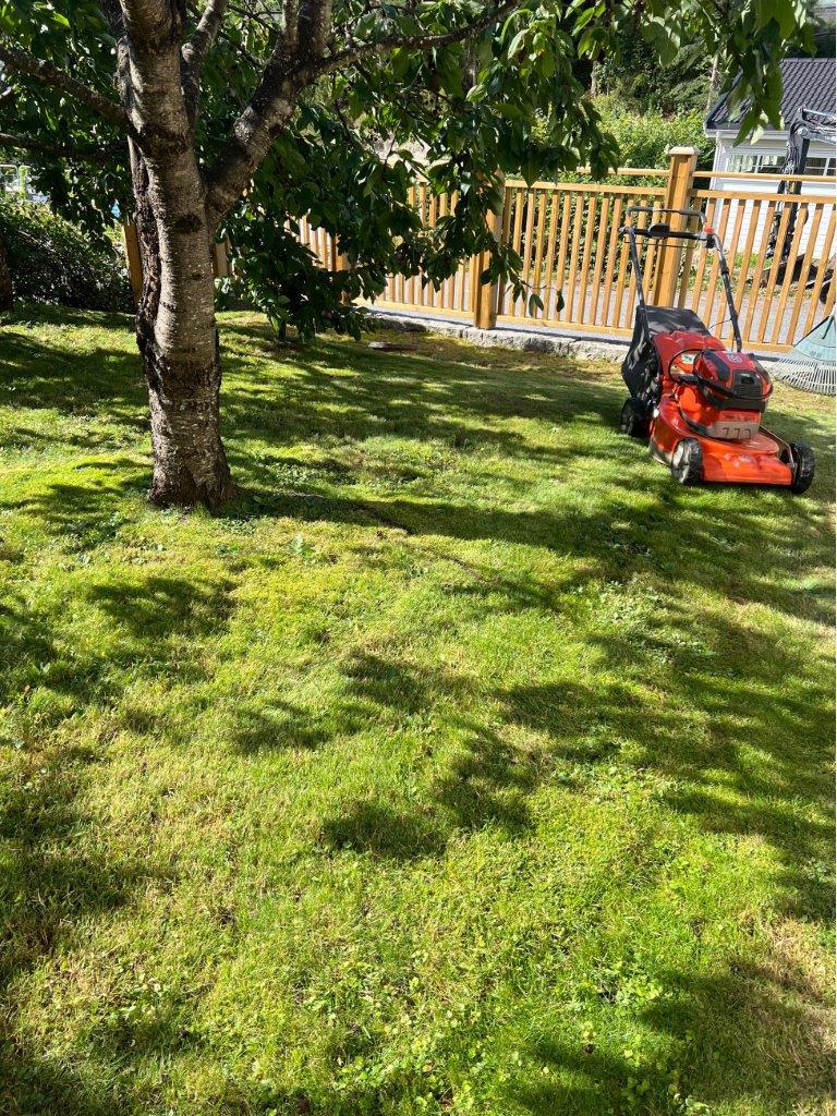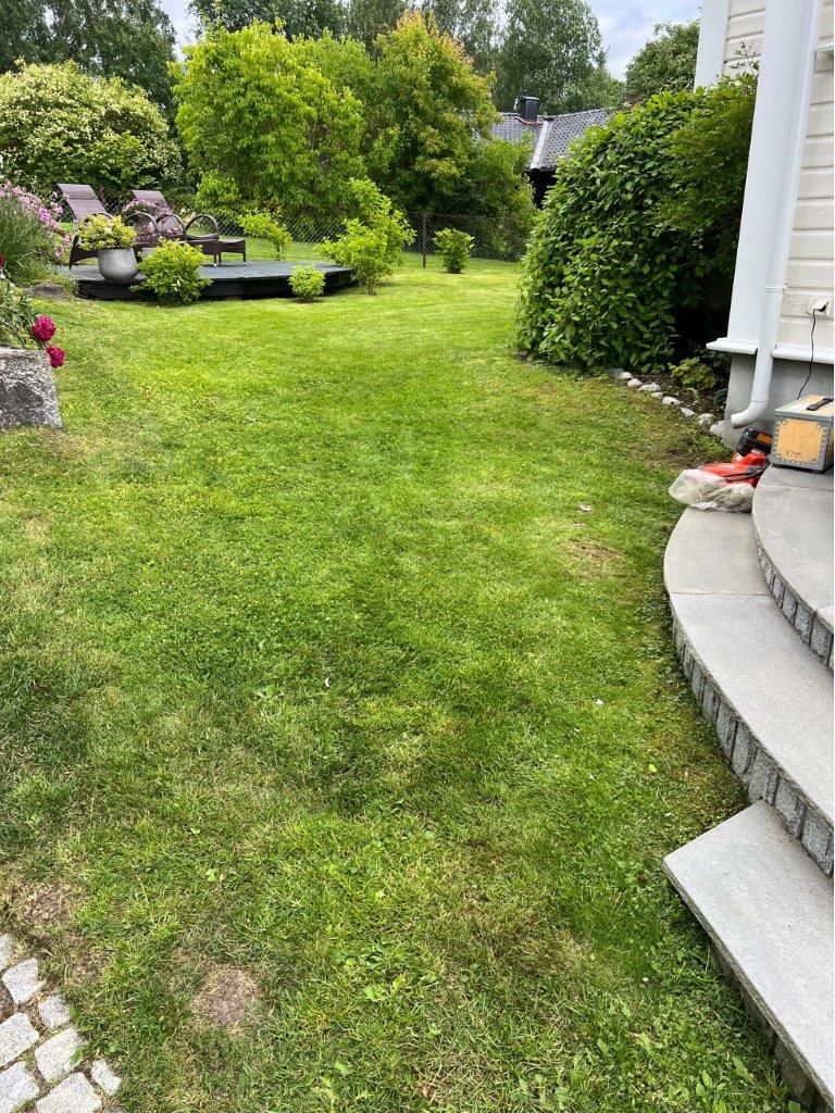 Plenen holdes grønn og frisk gjennom regelmessig klipping, gjødsling og vanning. Hekkene beskjæres og forynges gradvis for å bevare form og vitalitet, mens områdene rundt bed og kanter holdes fri for ugress. Resultatet er et ryddig og innbydende uteområde som er lett å bruke og behagelig å se på.